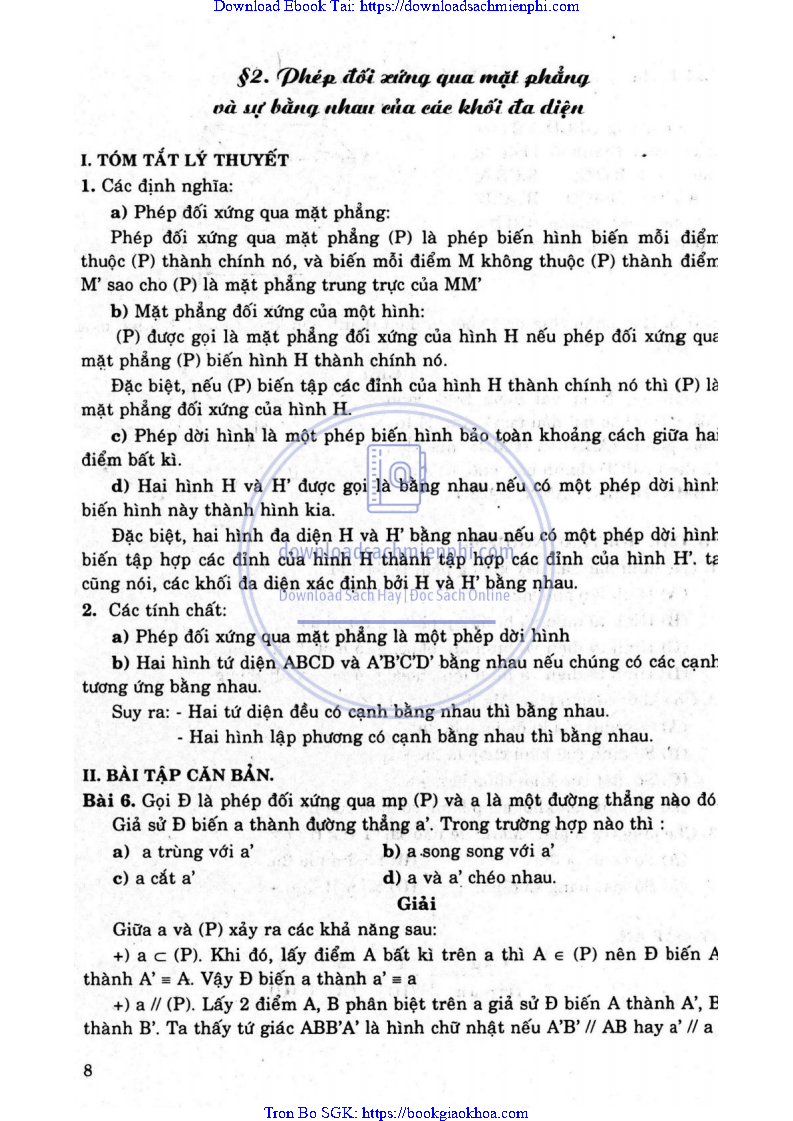 BÀI 2. PHÉP ĐỐI XỨNG QUA MẶT PHẲNG VÀ SỰ BẰNG NHAU CỦA CÁC KHỐI ĐA DIỆN
