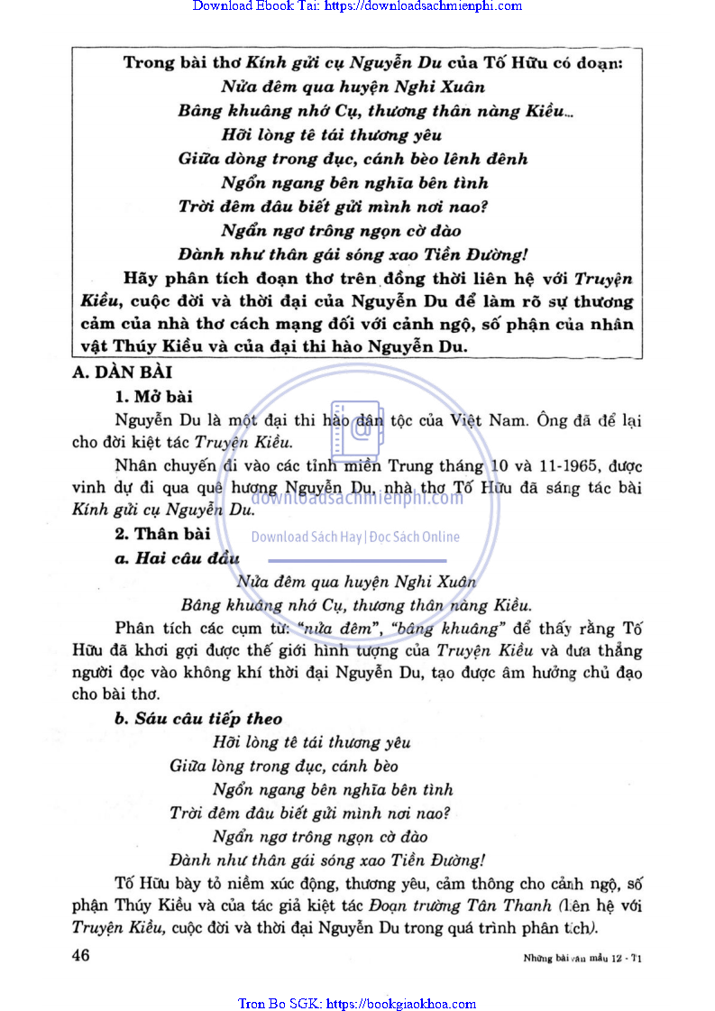 TRONG BÀI THƠ KÍNH GỬI CỤ NGUYỄN DU CỦA TỐ HỮU CÓ ĐOẠN: NỬA ĐÊM QUA HUYỆN NGHI XUÂN … ĐÀNH NHƯ THÂN GÁI SÓNG XAO TIỀN ĐƯỜNG. HÃY PHÂN TÍCH ĐOẠN THƠ … CỦA ĐẠI THI HÀO NGUYỄN DU