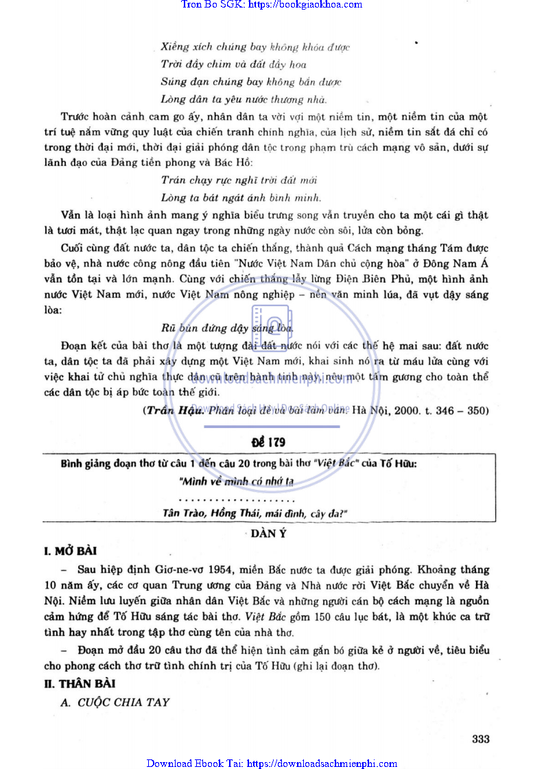- ĐỀ 179. BÌNH GIẢNG ĐOẠN THƠ TỪ CÂU 1 ĐẾN CÂU 20 TRONG BÀI THƠ VIỆT BẮC CỦA TỐ HỮU: “MÌNH VỀ MÌNH CÓ NHỚ TA…TÂN TRÀO, HỒNG THÁI, MÁI ĐÌNH CÂY ĐA?”