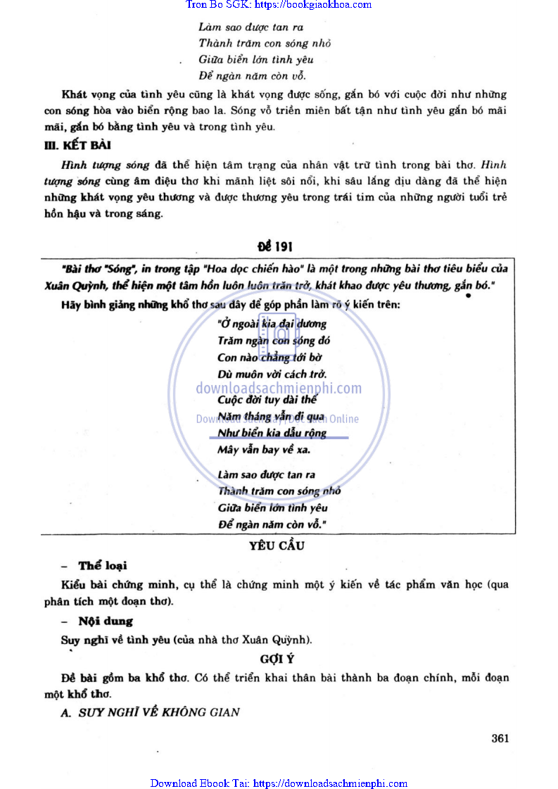 - ĐỀ 191. “BÀI THƠ “SÓNG” IN TRONG TẬP “HOA DỌC CHIẾN HÀO” LÀ MỘT TRONG NHỮNG BÀI THƠ TIÊU BIỂU CỦA XUÂN QUỲNH, THỂ HIỆN MỘT TÂM HỒN LUÔN LUÔN TRĂN TRỞ, KHÁT KHAO ĐƯỢC YÊU THƯƠNG, GẮN BÓ. HÃY BÌNH GIẢNG NHỮNG KHỔ THƠ SAU ĐÂY ĐỂ GÓP PHẦN LÀM RÕ Ý KIẾN TRÊN: “Ở NGOÀI KIA ĐẠI DƯƠNG…ĐỂ NGÀN NĂM CÒN VỖ”