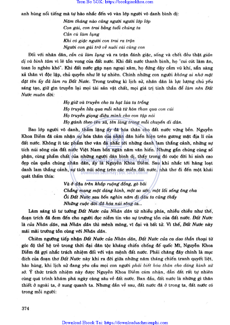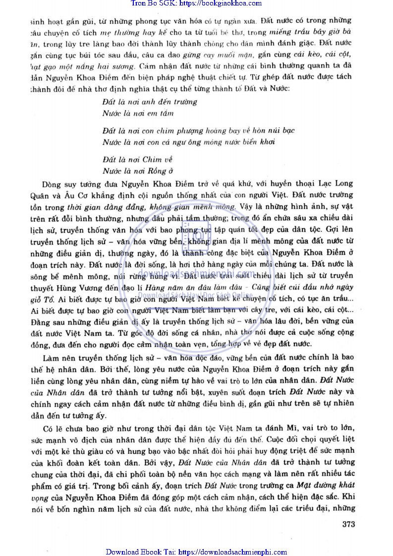 - ĐỀ 195. TRONG ĐOẠN THƠ “ĐẤT NƯỚC” (TRÍCH TRƯỜNG CA “MẶT ĐƯỜNG KHÁT VỌNG”), NGUYỄN KHOA ĐIỀM ĐÃ QUAN NIỆM ĐẤT NƯỚC NHƯ THẾ NÀO? SO VỚI NHỮNG NHÀ THƠ KHÁC, QUAN NIỆM CỦA NGUYỄN KHOA ĐIỀM CÓ GÌ MỚI VỀ TƯ TƯỞNG VÀ HÌNH THỨC BIỂU HIỆN?