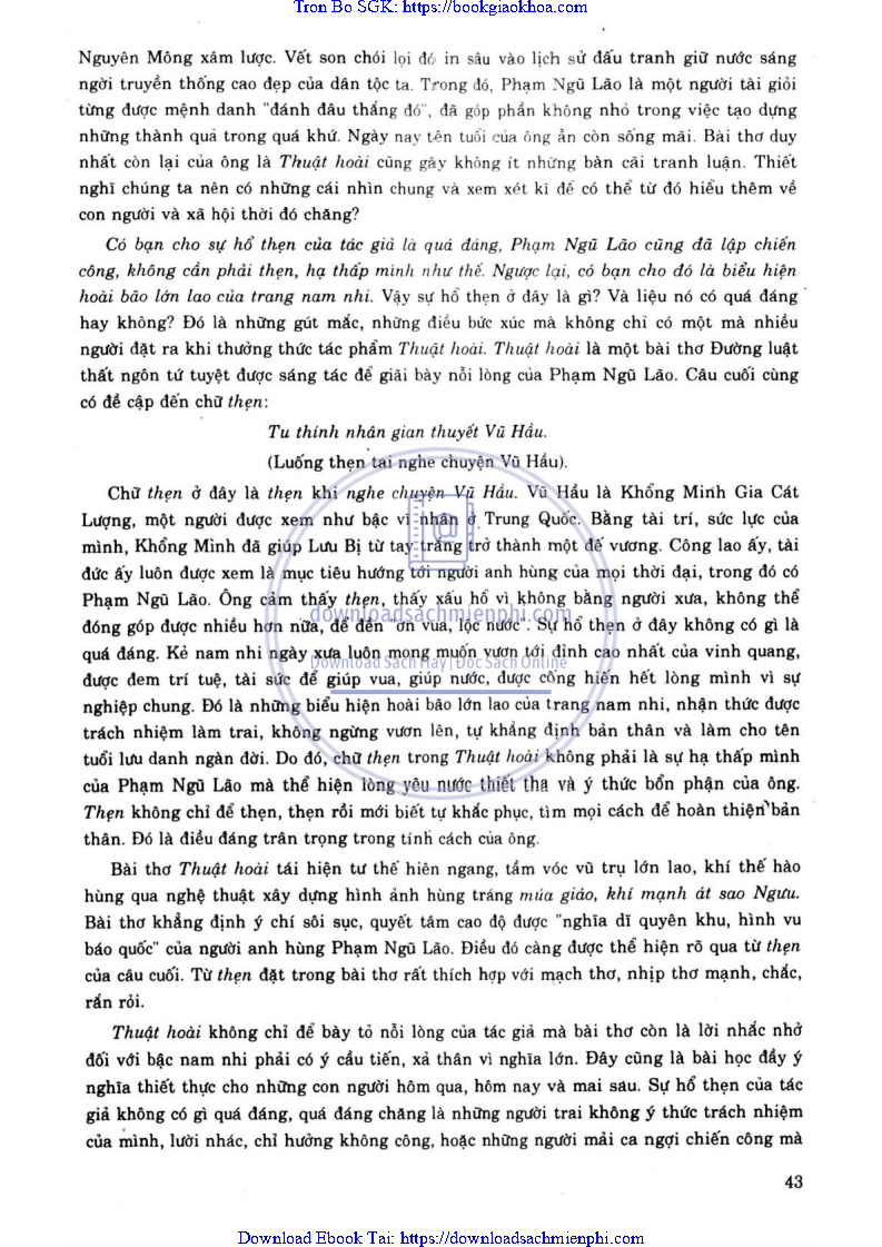 ĐỀ 25. HỌC BÀI THƠ “THUẬT HOÀI” CỦA PHẠM NGŨ LÃO CÓ BẠN CHO SỰ HỔ THẸN CỦA TÁC GIẢ LÀ QUÁ ĐÁNG. PHẠM NGŨ LÃO CŨNG ĐÃ LẬP CHIẾN CÔNG, KHÔNG CẦN PHẢI THẸN, HẠ THẤP MÌNH NHƯ THẾ. NGƯỢC LẠI CÓ BẠN CO ĐÓ LÀ BIỂU HIỆN HOÀI BÃO LỚN LAO CỦA TRANG NAM NHI. EM HÃY BÌNH LUẬN