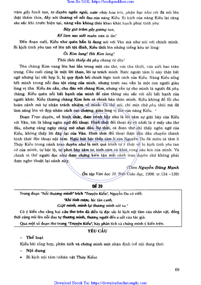 ĐỀ 43. TRONG ĐOẠN “NỖI THƯƠNG MÌNH” TRÍCH “TRUYỆN KIỀU”. NGUYỄN DU CÓ VIẾT: “KHI TỈNH RƯỢU, LÚC TÀN CANH. GIẬT MÌNH. MÌNH LẠI THƯƠNG MÌNH XÓT XA”. CÓ Ý KIẾN CHO RẰNG HAI CÂU THƠ TRÊN ĐÃ DIỄN TẢ ĐẶC SẮC BI KỊCH NỘI TÂM CỦA NHÂN VẬT. ĐỒNG THỜI CŨNG NÓI LÊN NỖI ĐAU TỰ THƯƠNG MÌNH, THƯƠNG NGƯỜI ĐẾN U UẤT CỦA TÁC GIẢ. QUA MỘT SỐ ĐOẠN THƠ TRONG “TRUYỆN KIỀU”. HÃY PHÂN TÍCH VÀ CHỨNG MINH Ý KIẾN TRÊN