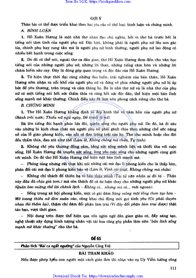 - ĐỀ 65. NHẬN ĐỊNH VỀ THƠ HỒ XUÂN HƯƠNG, SÁCH “VĂN HỌC TRUNG ĐẠI VIỆT NAM” CỦA LÊ TRÍ VIỄN CÓ VIẾT: “THƠ HỒ XUÂN HƯƠNG LÀ TIẾNG NÓI TÂM TÌNH CỦA NGƯƠI PHỤ NỮ, THỂ HIỆN MỘT BẢN LĨNH SỐNG MẠNH MẼ KHÁC THƯỜNG”. EM HÃY BÌNH LUẬN VÀ CHỨNG MINH Ý KIẾN TRÊN