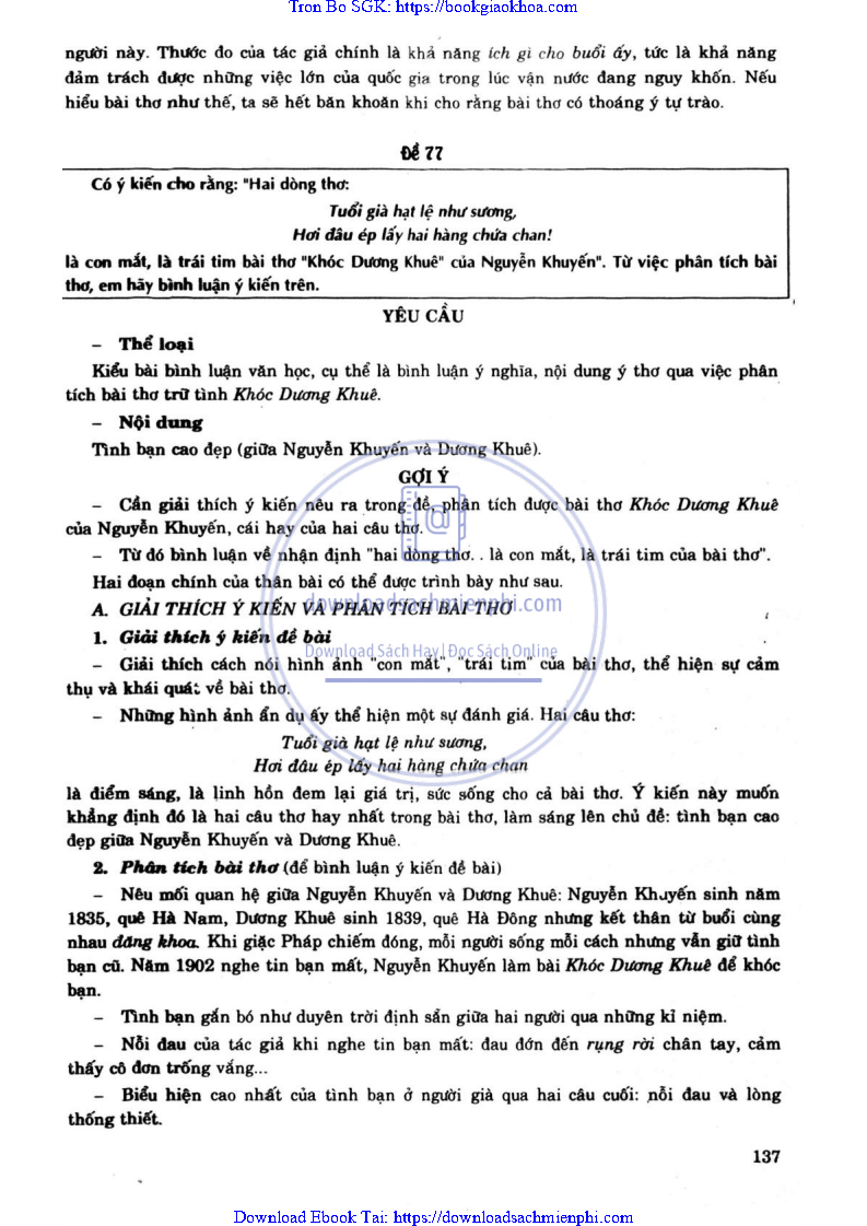 - ĐỀ 78. CÓ Ý KIẾN CHO RẰNG HAI DÒNG THƠ: “TUỔI GIÀ HẠT LỆ NHƯ SƯƠNG. HƠI ĐÂU ÉP LẤY HAI HÀNG CHỨA CHAN!” LÀ CON MẮT, LÀ TRÁI TIM BÀI THƠ “KHÓC DƯƠNG KHUÊ” CỦA NGUYỄN KHUYẾN. TỪ VIỆC PHÂN TÍCH BÀI THƠ, EM HÃY BÌNH LUẬN Ý KIẾN TRÊN