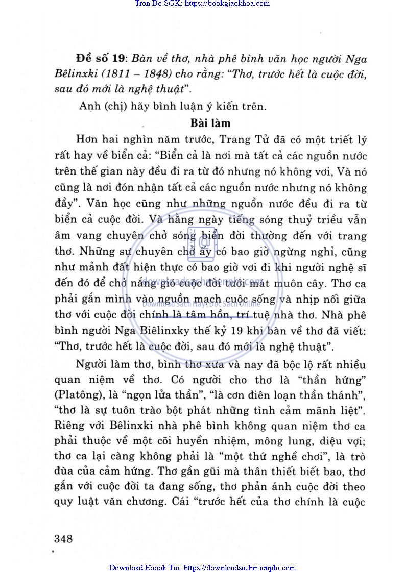 ĐỀ 19. BÀN VỀ THƠ, NHÀ PHÊ BÌNH VĂN HỌC NGƯỜI NGA BEELINXKI (1811-1848) CHO RẰNG: “THƠ, TRƯỚC HẾT LÀ CUỘC ĐỜI, SAU ĐÓ MỚI LÀ NGHỆ THUẬT”. ANH (CHỊ) HÃY BÌNH LUẬN Ý KIẾN TRÊN